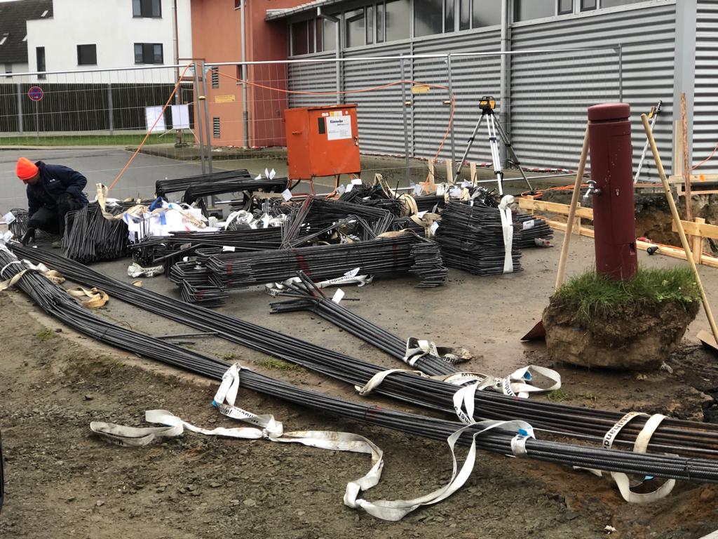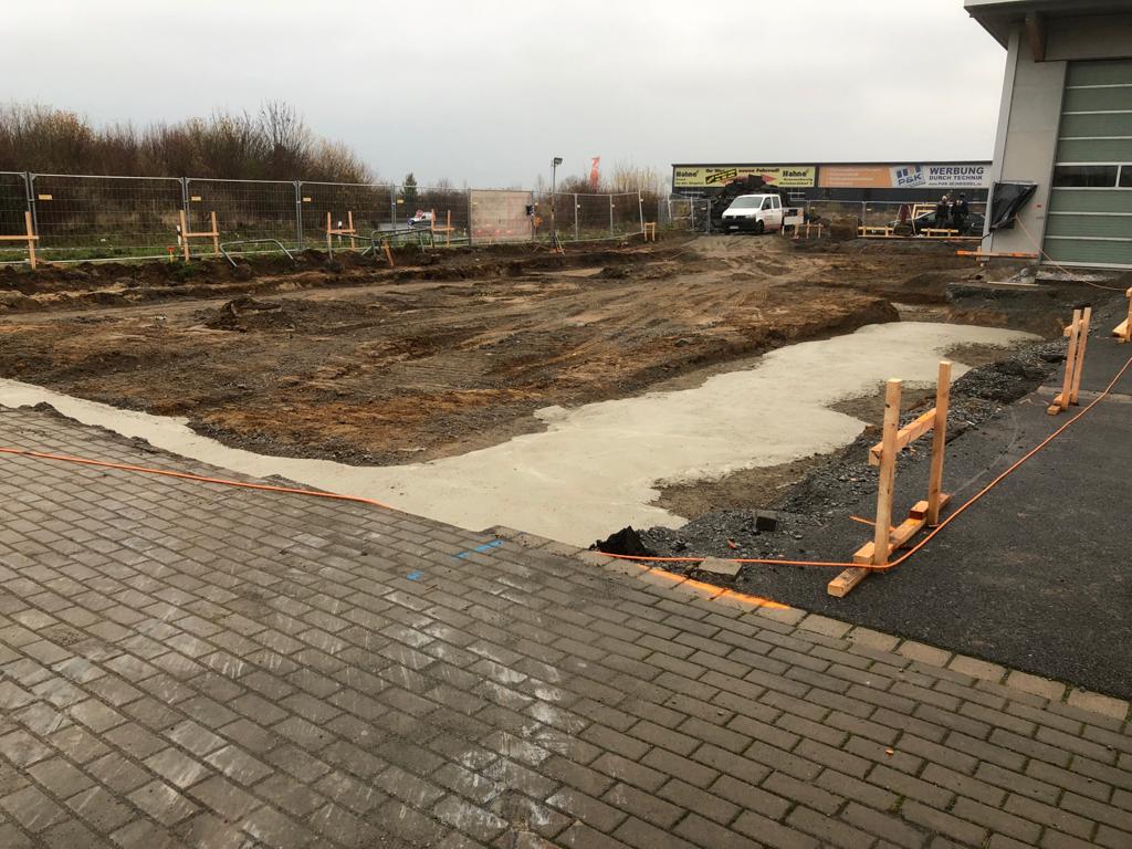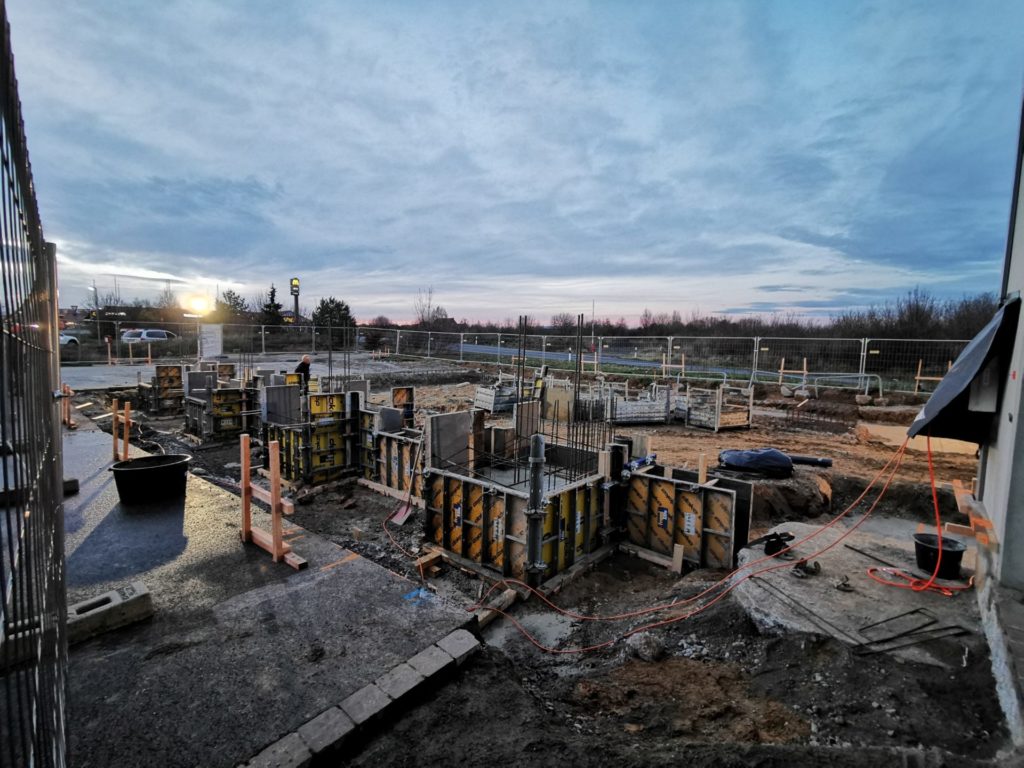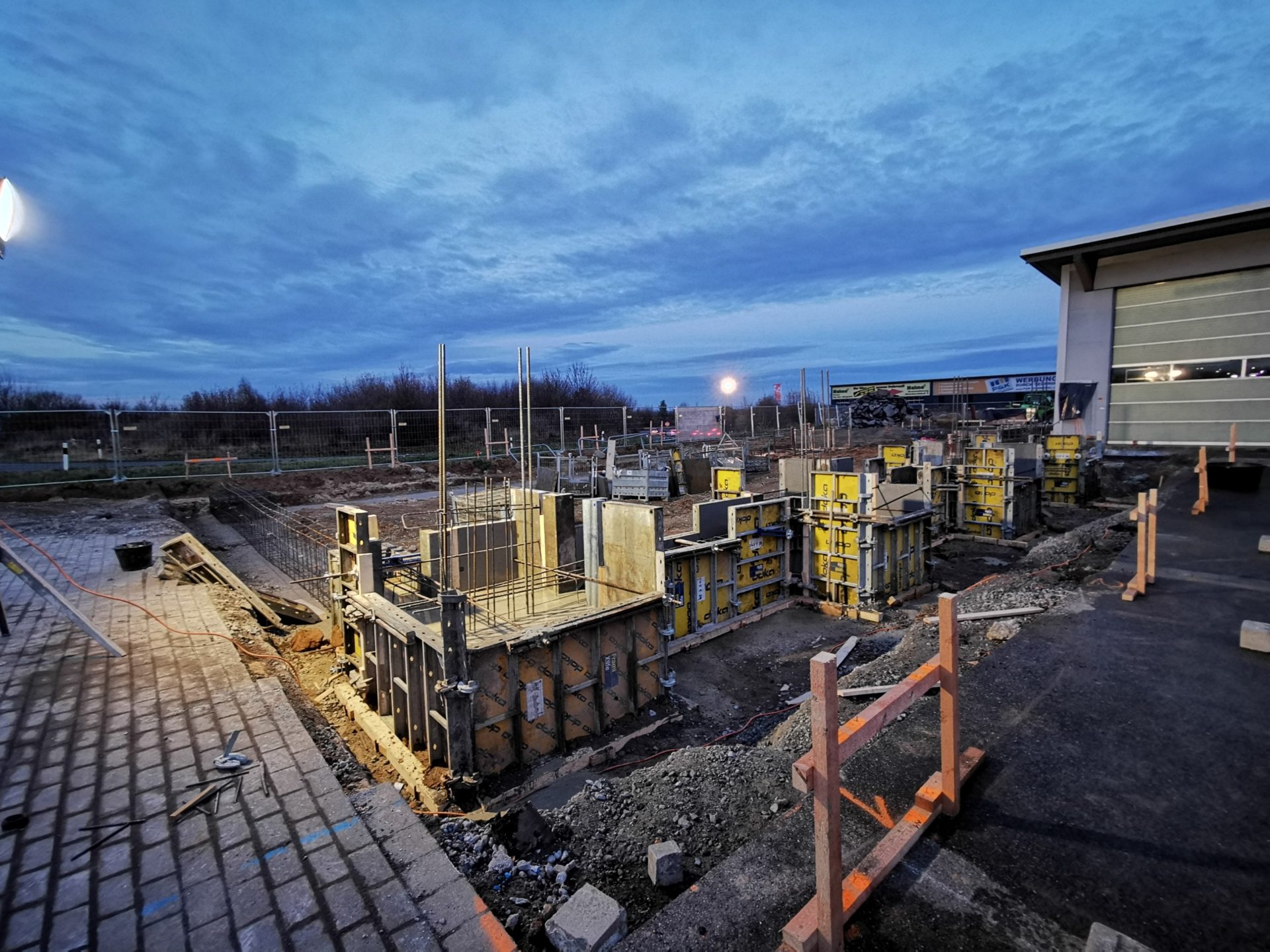Pünktlich zum Beginn des Dezembers sind die ersten Betonmischer auf unser Gelände gefahren. Es wurden ebenen Flächen für die Schalungselemente geschaffen. Nach dem Abbinden des Betons haben die Mitarbeiter der ausführenden Firma damit begonnen die Schalungselemente auszurichten und somit die Verschalung zu erstellen.
