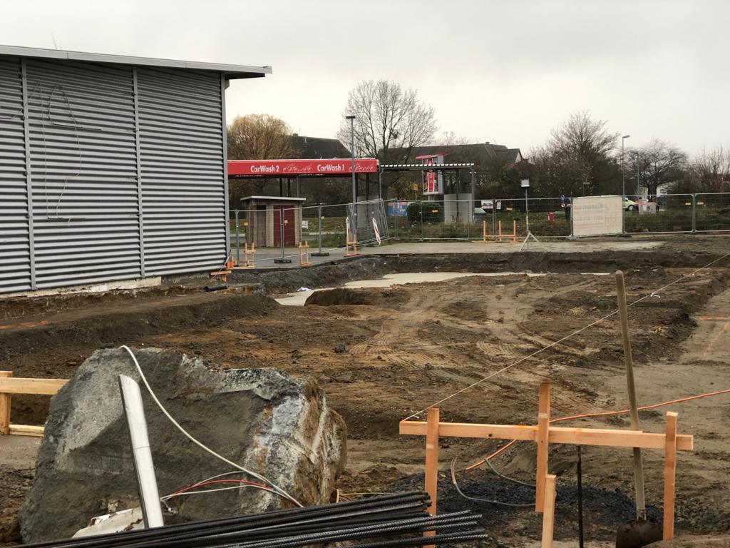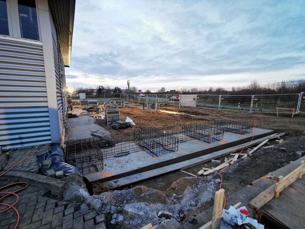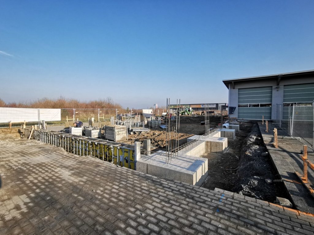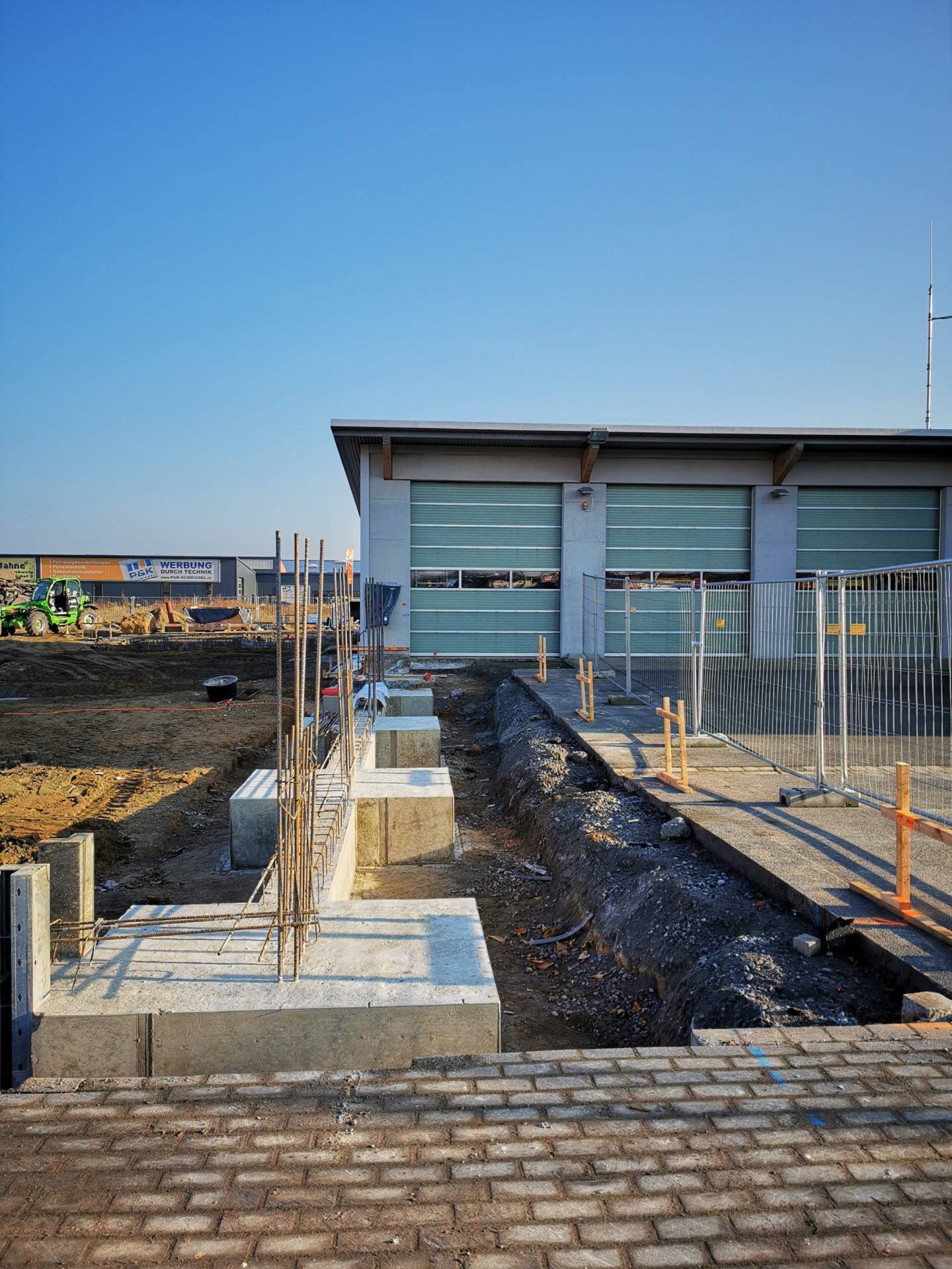 Die Fundamente werden im Uhrzeigersinn erstellt – begonnen wurde im südlichen Bereich des Anbaus. Deutlich zu sehen sind die Standplätze der zukünftigen Pfeiler zwischen den Toren.