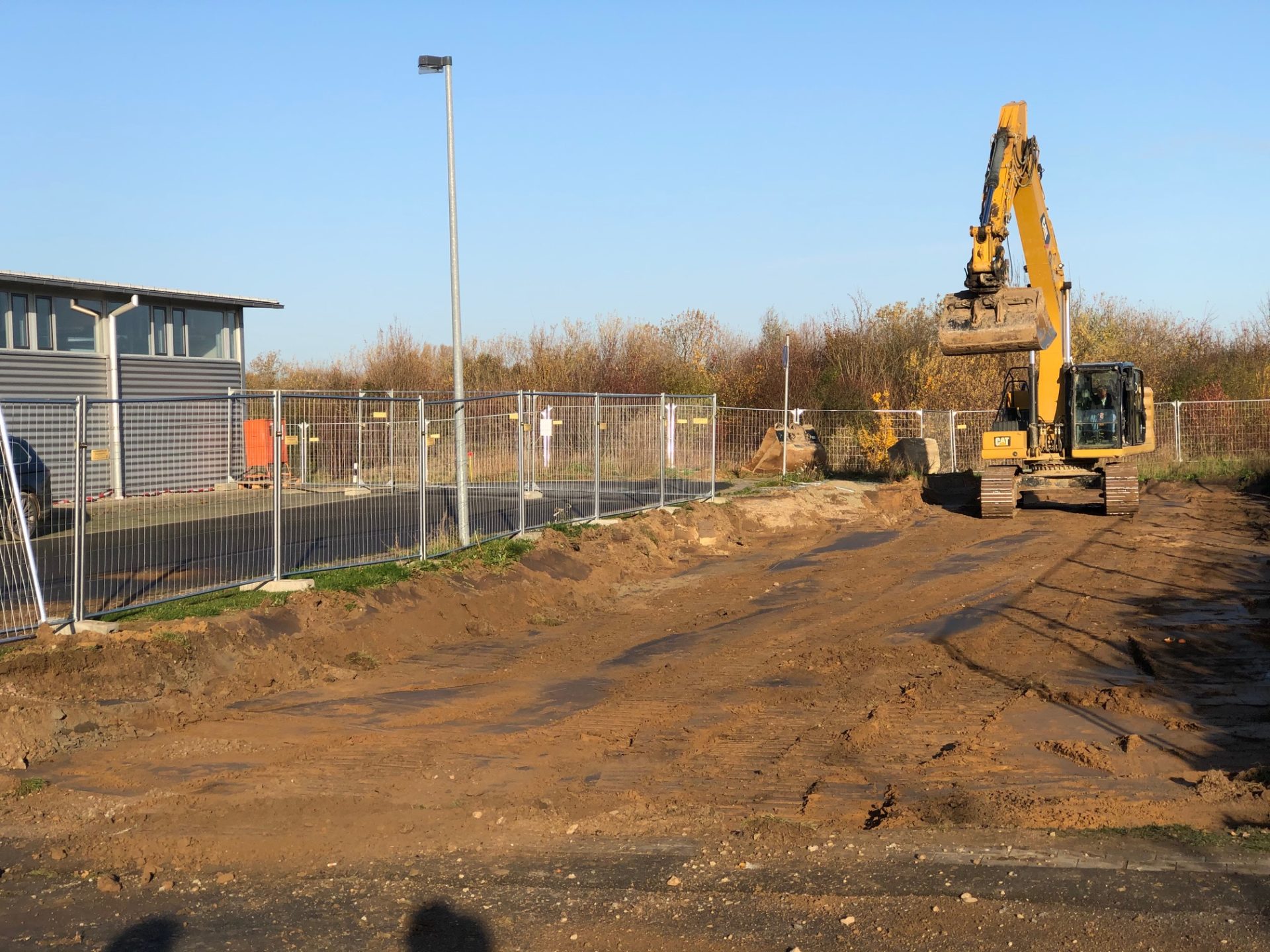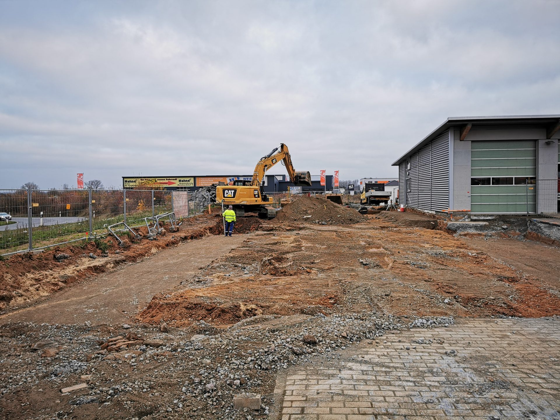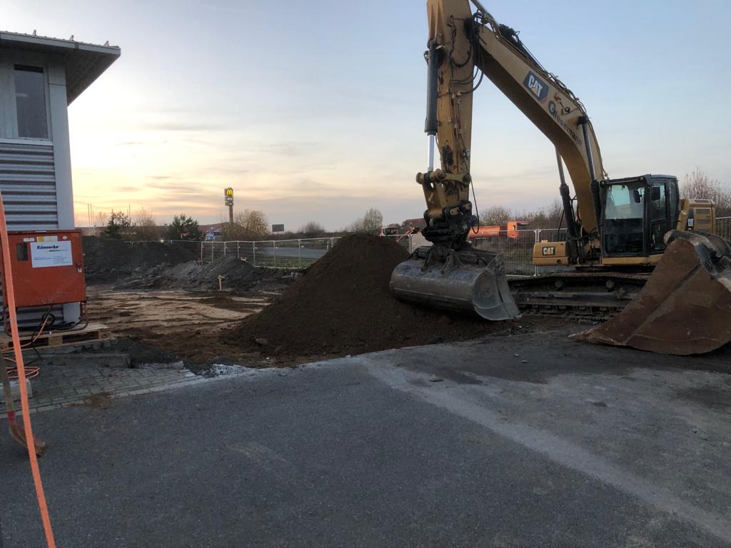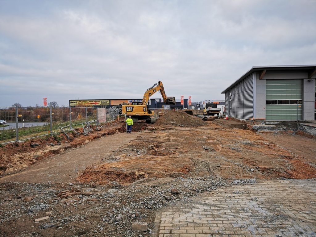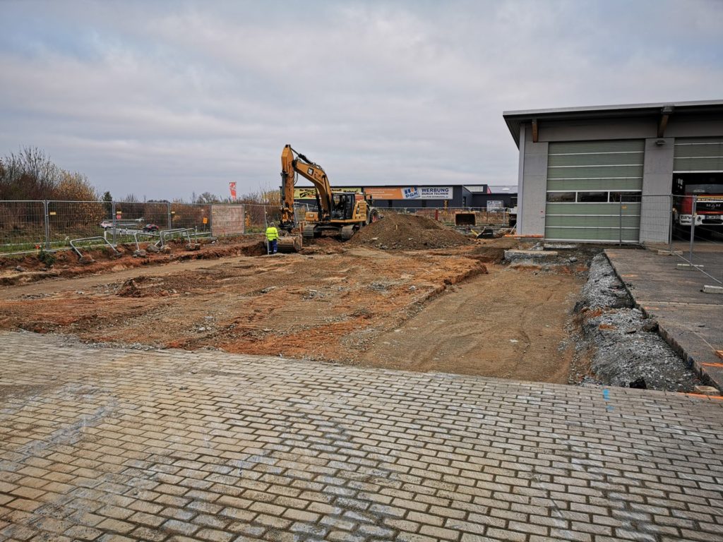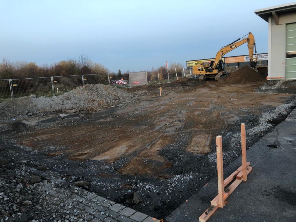 In der letzten Novemberwoche begannen die Tiefbauarbeiten. Die ausführenden Firmen arbeiteten im Rekordtempo. Innerhalb von einer Woche wurden Teile der Hoffläche und der Parkplätze aufgenommen. Die Fundamentbereiche wurden ausgehoben und mit Mineralgemisch aufgefüllt und verdichtet.
