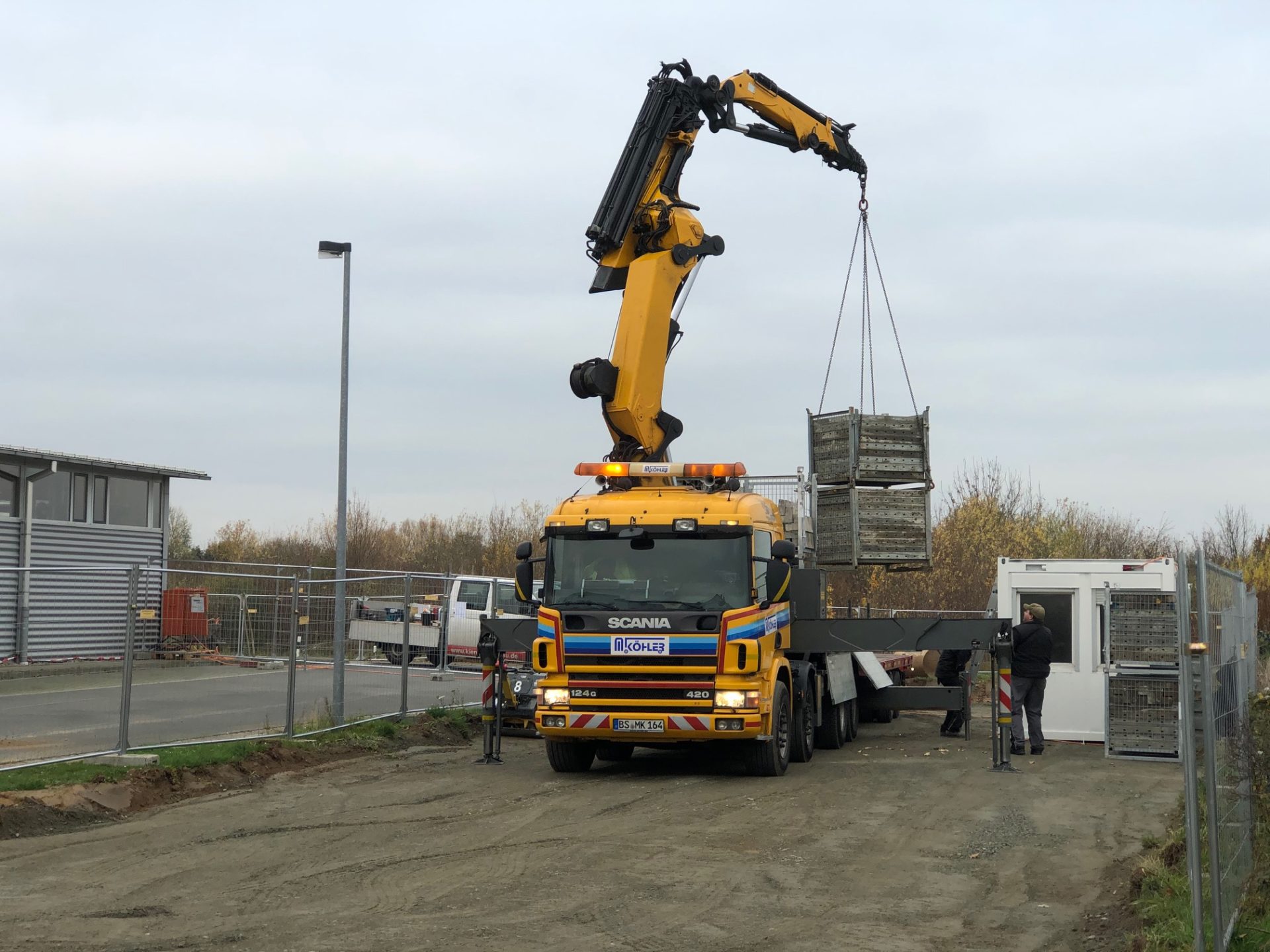Auf der Grundstückswestseite wurde Erdreich abgetragen und Mineralgemisch verbaut. Auf diesen künftigen Parkflächen ist damit ein Lagerplatz für Baumaterialen und den Aufenthaltscontainer der Bauarbeiter entstanden.