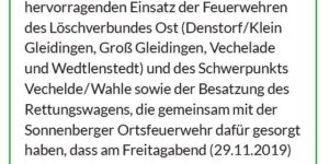 Ein besonderes Dankeschön hat unsere Einsatzkräfte mit der Dezemberausgabe des Informationsblattes „Der Vechelder“ erreicht. Am 29.11.2019 haben wir gemeinsam mit den Ortsfeuerwehren des Löschverbundes Ost einen Schornsteinbrand in Sonnenberg erfolgreich …
