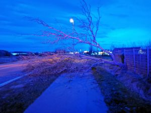 Beseitigung eines auf dem Fahrradweg liegenden Baumes mittels Kettensäge.
