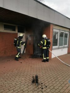 Ein Trupp unter Atemschutz konnte dann schnell mit einem C-Rohr die brennende Eingangstür löschen. Auch bedingt durch die Schwarzfärbung der Wände ist der Schaden nicht unerheblich. Der betroffene Raum ist nun nicht mehr nutzbar.