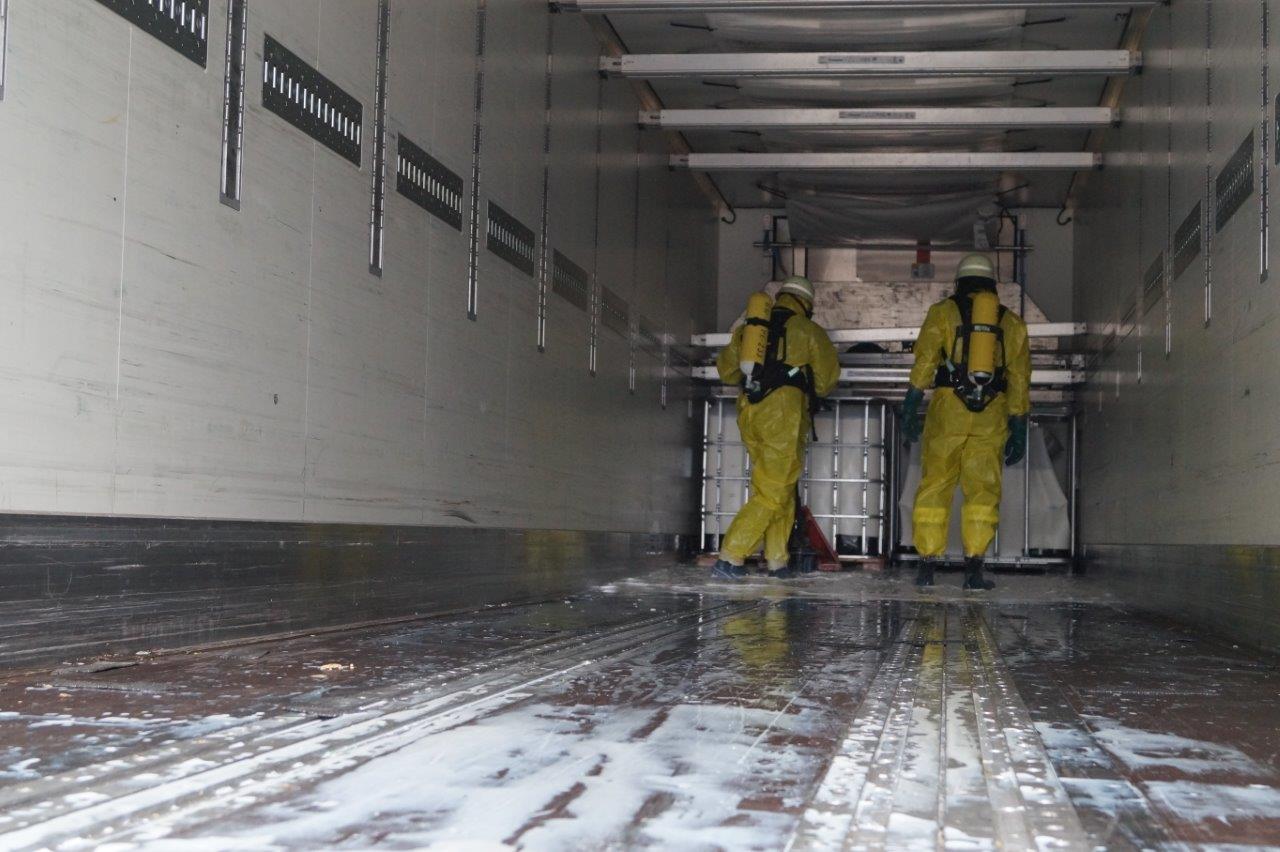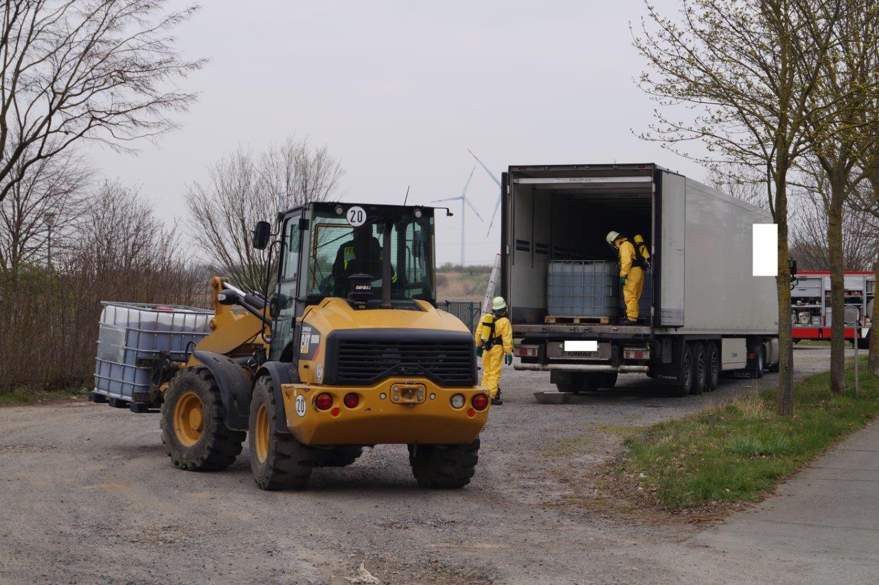 Die erste Erkundung im Auflieger erfolgte unter Chemikalienschutzanzug bei gleichzeitiger Sicherstellung der Dekontamination. Der defekte Behälter wurde stirnseitig im Auflieger vorgefunden. Insofern musste das Fahrzeug fast komplett entladen werden. Die IBC-Container und einige Fässer wurden im Auflieger von zwei Einsatzkräften unter Schutzkleidung rangiert und mittels eines Radladers mit Palettengabel entladen und auf Folie abgestellt. Der havarierte Behälter musste letztendlich nicht geborgen werden, da festgestellt wurde, dass das Umpumpen besser direkt auf der Ladefläche durchgeführt werden kann.
