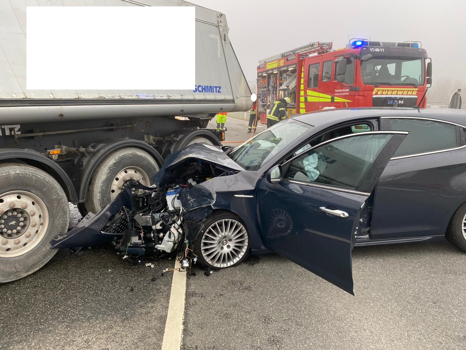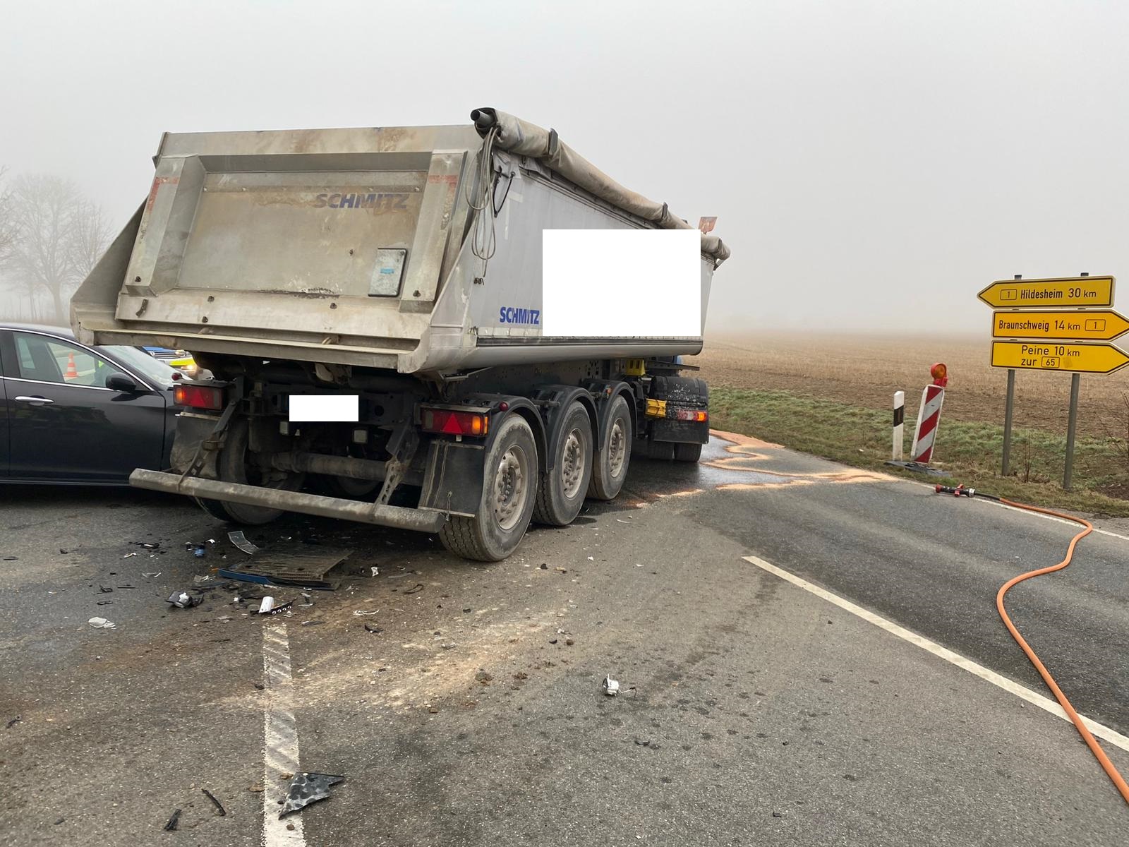 Offensichtlich wollte ein LKW mit Sattelauflieger aus dem Gewerbegebiet (Hildesheimer Straße) kommend, links auf die Umgehungsstraße in Richtung Bettmar abbiegen. Dabei muss der Fahrer einen aus Bettmar kommenden PKW übersehen haben. So fuhr die Fahrerin des PKW, wohl fast ungebremst, in den Bereich zwischen Fahrerhaus und Dieseltank der Sattelzugmaschine.