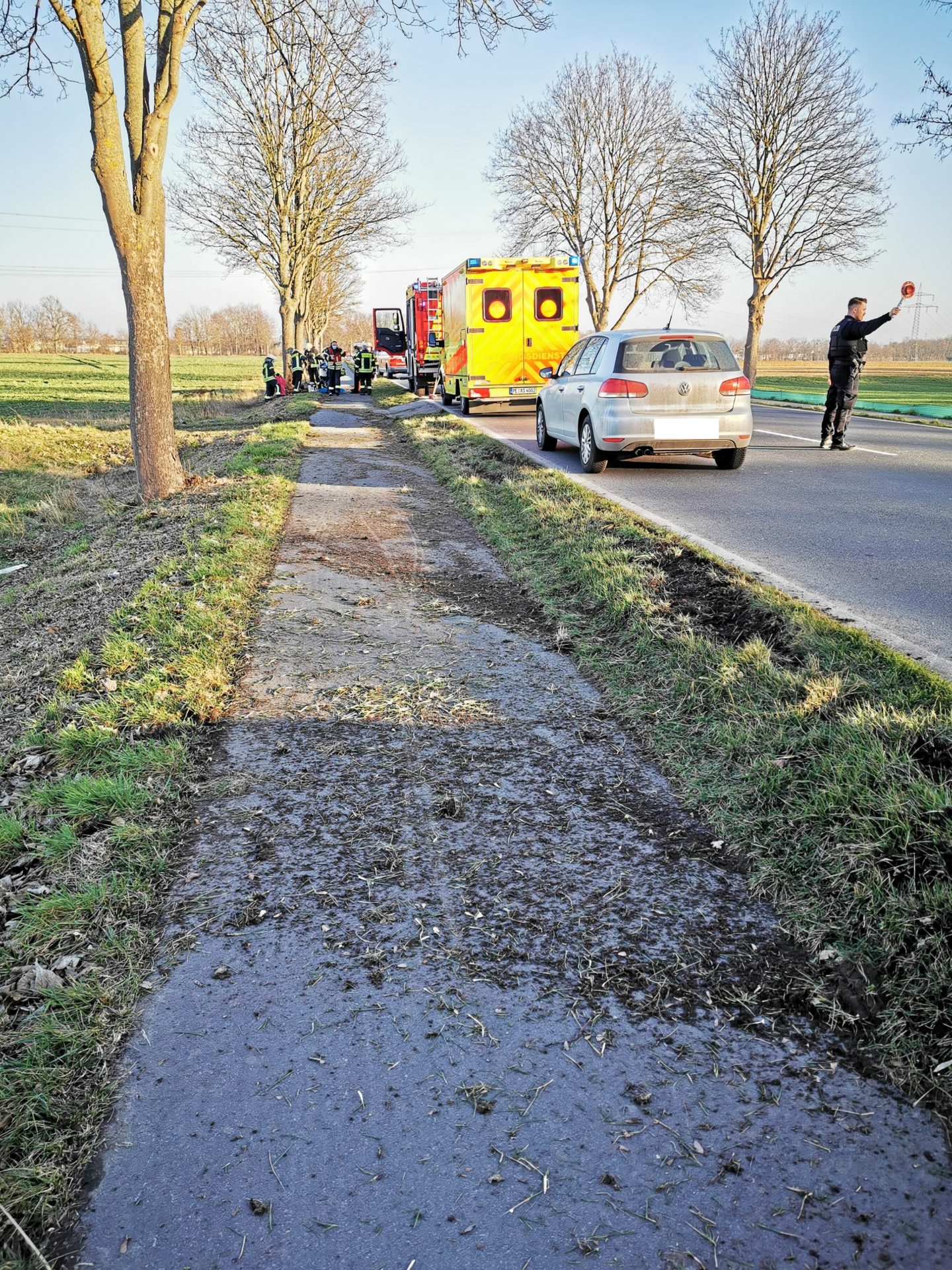 Der Fahrer stand beim Eintreffen der Feuerwehrkräfte neben seinem Motorrad – er konnte direkt an die zeitgleich eintreffende Besatzung des Rettungswagens übergeben werden.