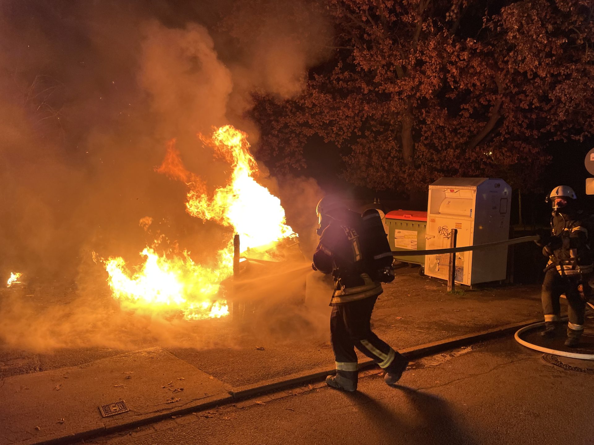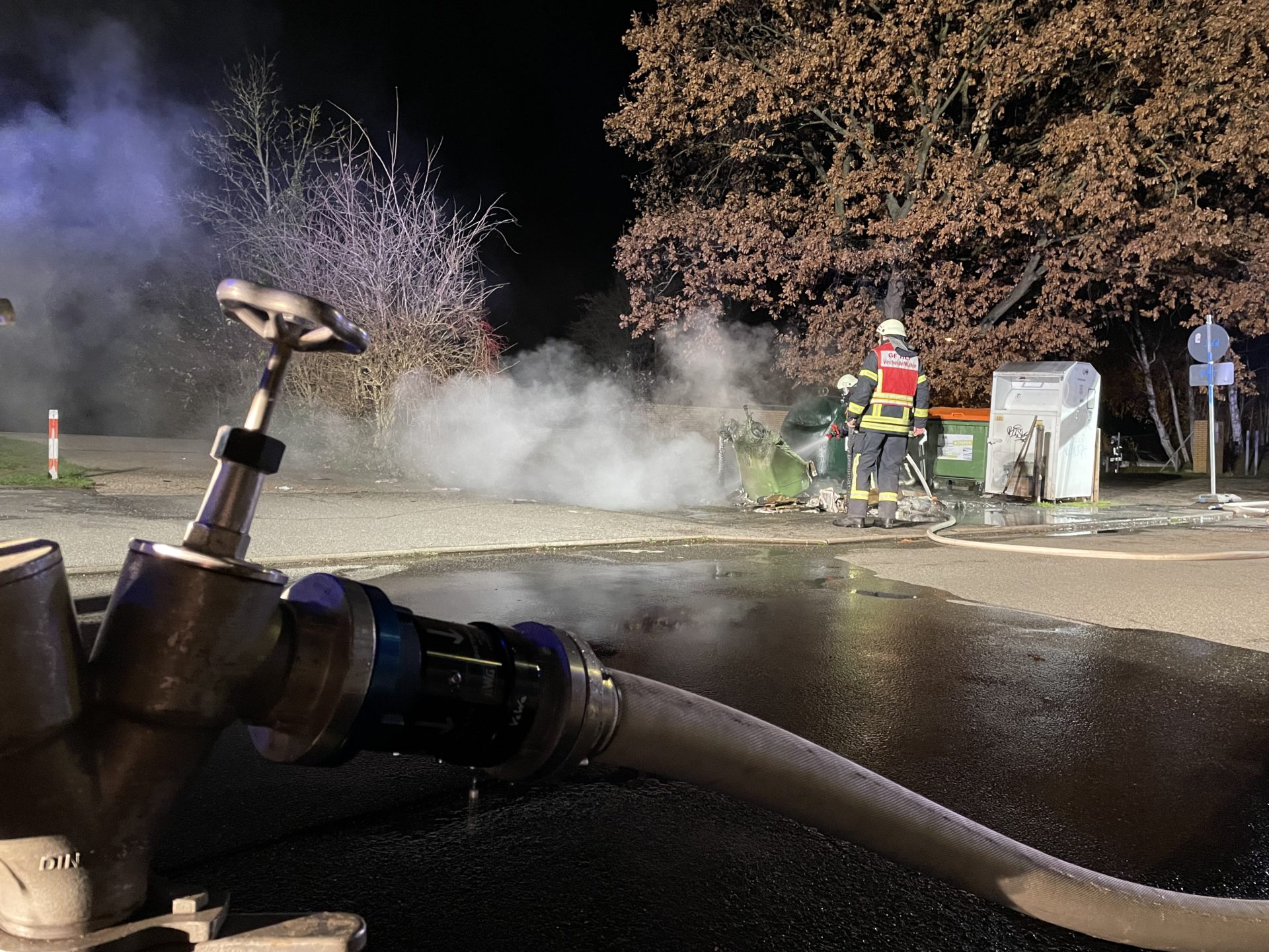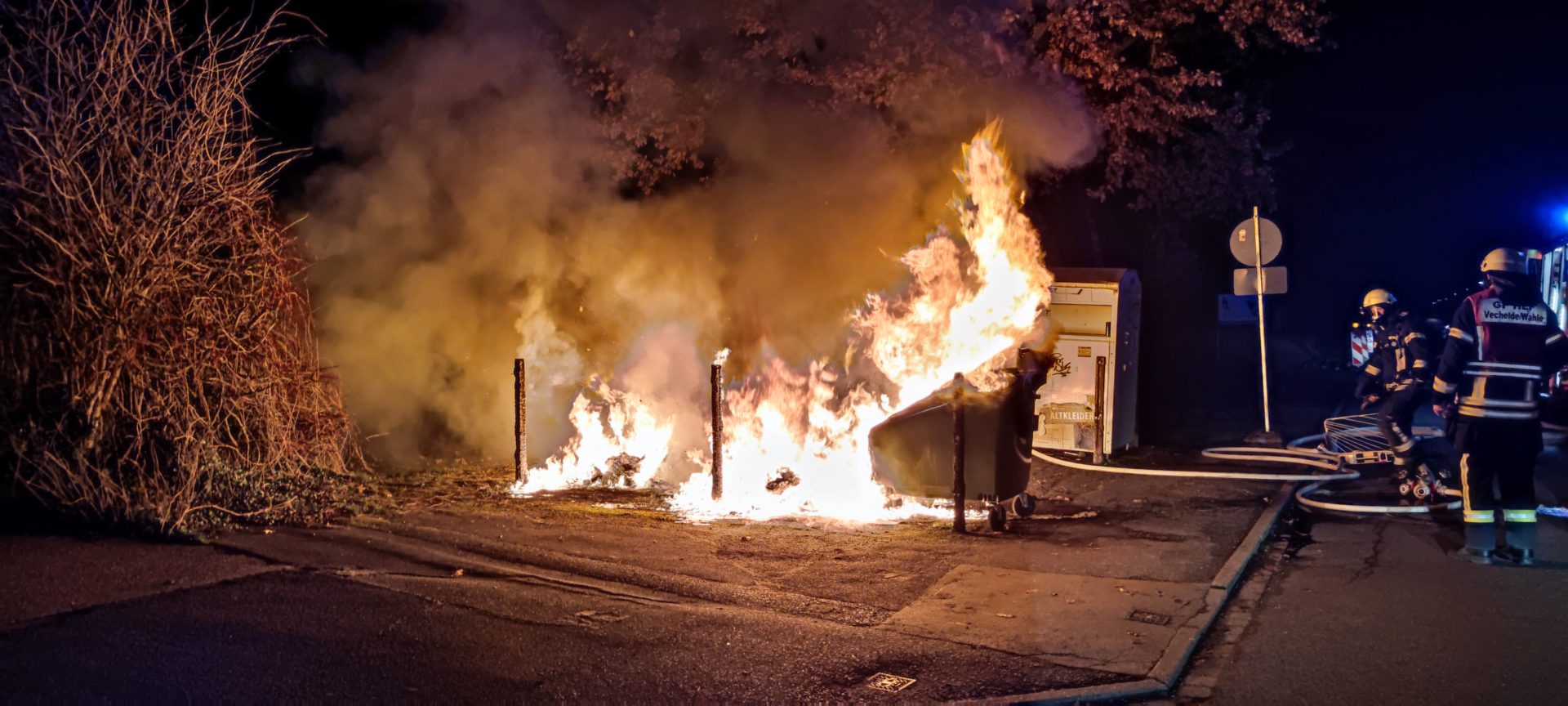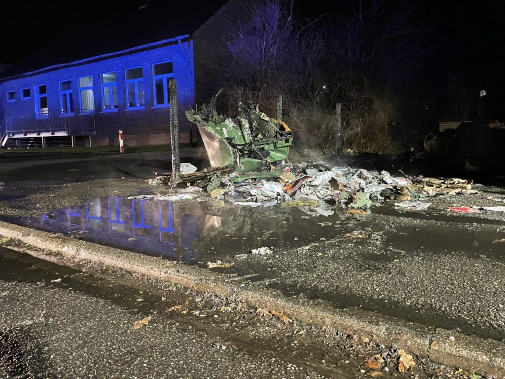 Um 01:45 Uhr wurde eine erweiterte Löschgruppe des Vechelder Feuerwehrschwerpunktes von der Integrierten Regionalleitstelle mit dem Einsatzstichwort „B1“ (Kleinbrand) alarmiert. Beim Eintreffen der Einsatzkräfte, die mit dem Einsatzleitwagen, einem Löschgruppen- und einem Tanklöschfahrzeug einsetzten, brannten zwei Papier- und ein Altglas-Sammelbehälter total. Ein zweiter Altglasbehälter hatte sich bereits durch die Wärmestrahlung verformt.
