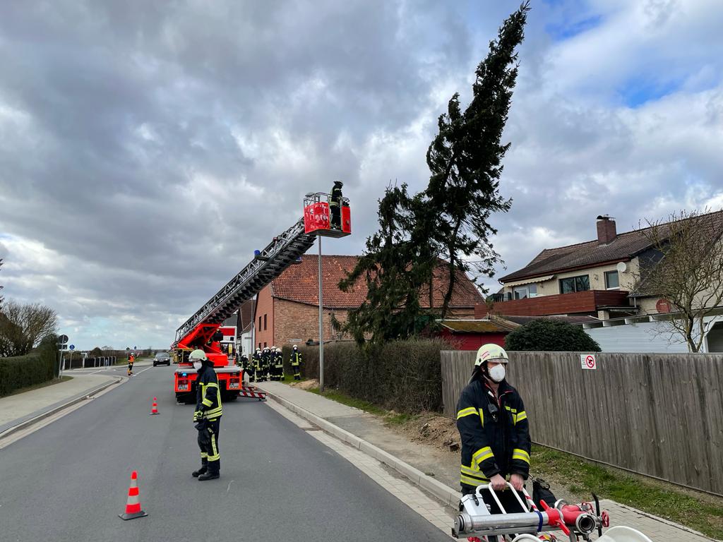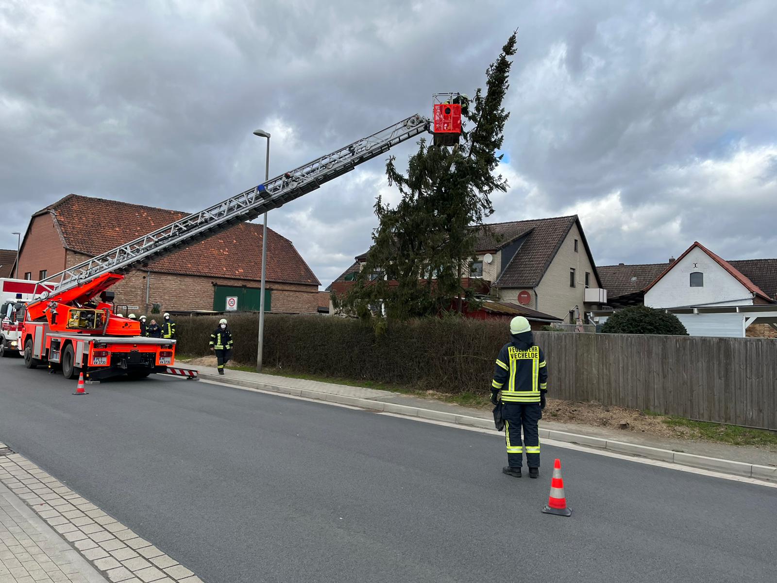 Vor Ort mussten mehrere umsturzgefährdete Nadelbäume in der Höhe stark reduziert werden. Die Arbeiten wurden vom Drehleiterkorb aus mit einer Bügelsäge und einer akkubetriebenen Säbelsäge durchgeführt. Während des Drehleitereinsatzes auf der B 65 sicherten die Ortsfeuerwehren Bodenstedt und Sierße/Fürstenau die Einsatzstelle ab.