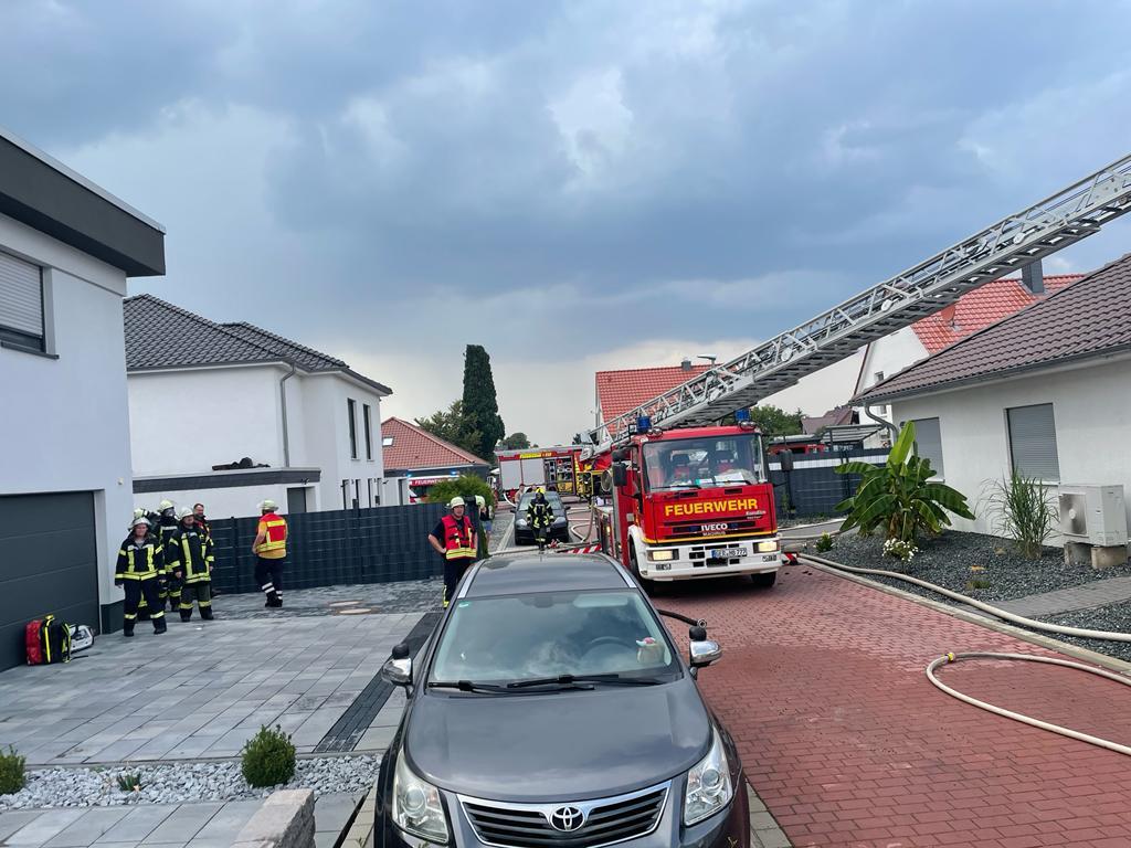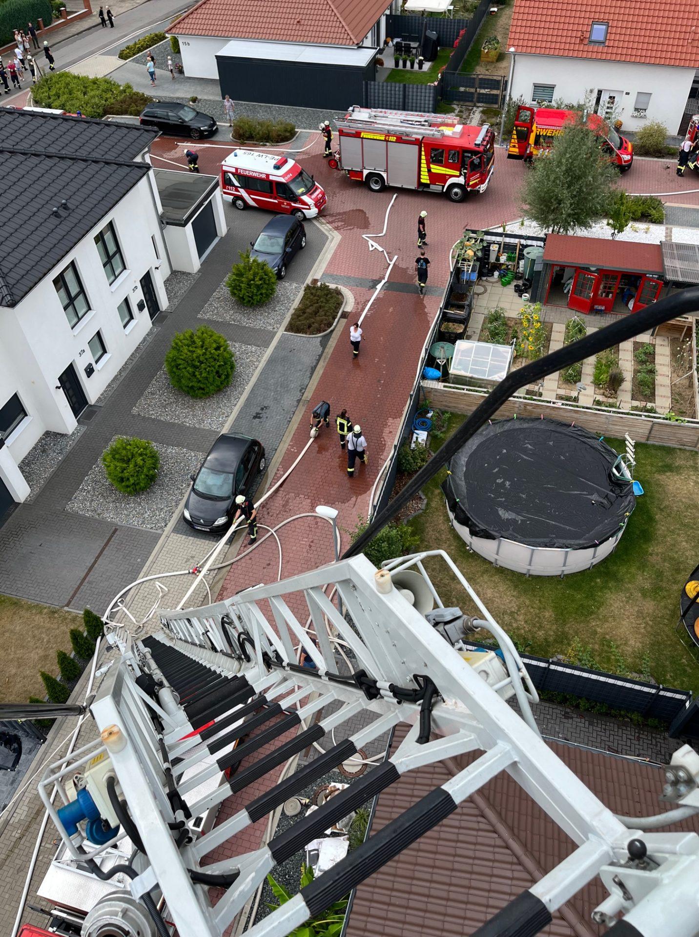 Um 13:38 Uhr wurde von der Integrierten Regionalleitstelle, auf Anforderung der Gemeinde Ilsede, unsere Drehleitergruppe alarmiert; in Groß Lafferde brannte es in einem Wohngebiet. Von einem Carport ausgehend, war das Feuer in das Walmdach eines eingeschossigen Doppelhauses gelaufen.