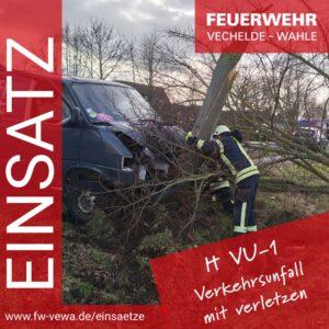 Ein Transporter war aus unbekannter Ursache gegen einen am Straßenrand stehenden Baum gefahren. Beide Insassen wurden durch den Rettungsdienst versorgt.