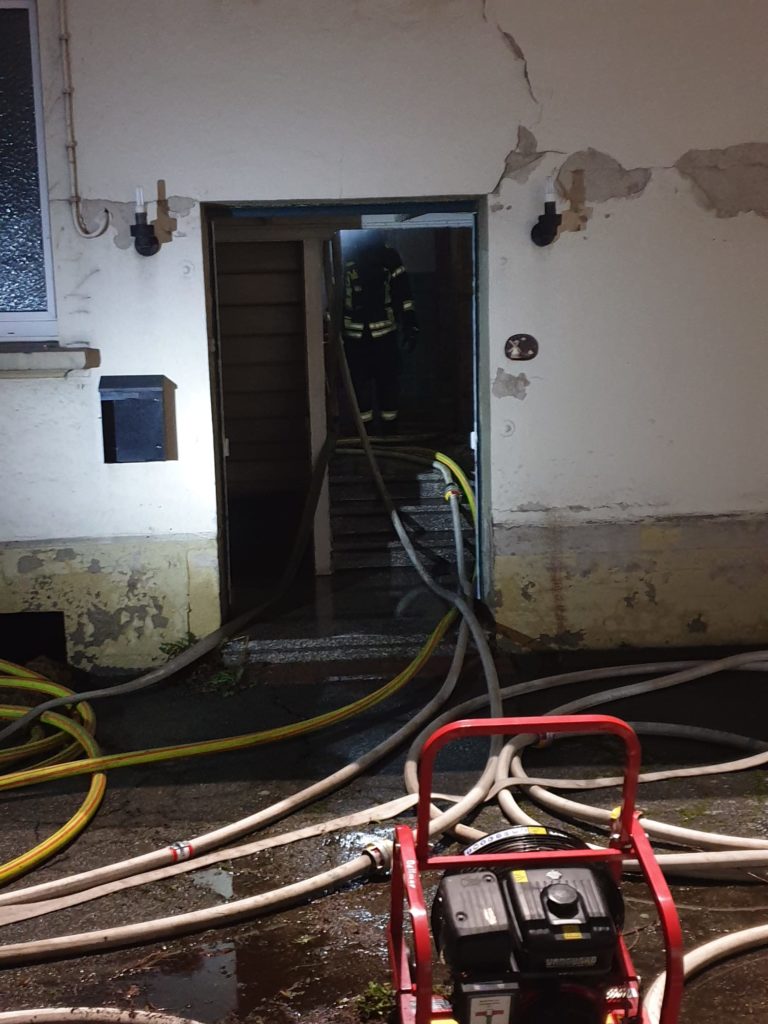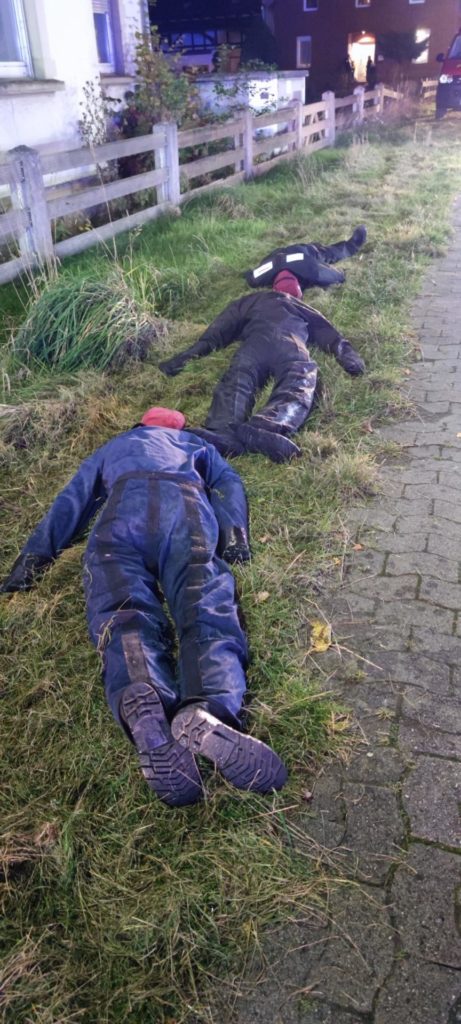 Des Weiteren wurden vier Dummys im Objekt als vermisste Personen positioniert. Um diese auch mit den mitgeführten Wärmebildkameras schnell auffinden zu können, wurden zwei Dummys mit heißem Wasser gefüllten Säcken „beschwert“.