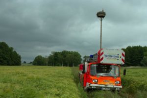 Jedes Jahr helfen wir dem „Storchenvater“ Georg Fiedler bei der Beringung von Jungstörchen in luftiger Höhe. Schließlich verfügen wir mit der Drehleiter über ein Fahrzeug, mit dem die meisten Horste in der Gemeinde Vechelde problemlos erreicht werden können. Auch in der Gemeinde Lengede werden wir tätig, an einem Horst zwischen Klein Lafferde und Woltwiesche – das haben die Lengeder Bürgermeisterin und der Vechelder Bürgermeister so vereinbart. Und, dass ein spezieller Weidenkorb, den wir von der Drehleiter aus im vergangenen Jahr auf einem Schornstein in Wendeburg montiert haben, heute mit einem Horst belegt ist, begeistert uns. Um im Feuerwehrjargon zu sprechen, derartige „Nachbarschaftshilfe“ führen wir gern durch.
