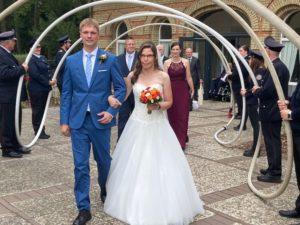 Nach der Trauung in der Remise am Vechelder Bürgerzentrum waren 20 Einsatzkräfte dabei, um unseren Sicherheitsbeauftragten Hendrik Geerken, nach der Trauung mit seiner langjährigen Freundin Dorina, ins Eheglück zu führen.
