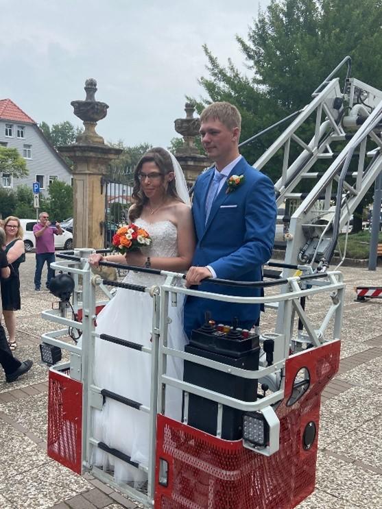 Schon etwas ängstlich schaute Dorina auf den Rettungskorb der Drehleiter; wahrscheinlich weniger von Höhenangst geplagt, sondern vielmehr von der Sorge, ob ihr großartiges Brautkleid überhaupt in den Korb passt.