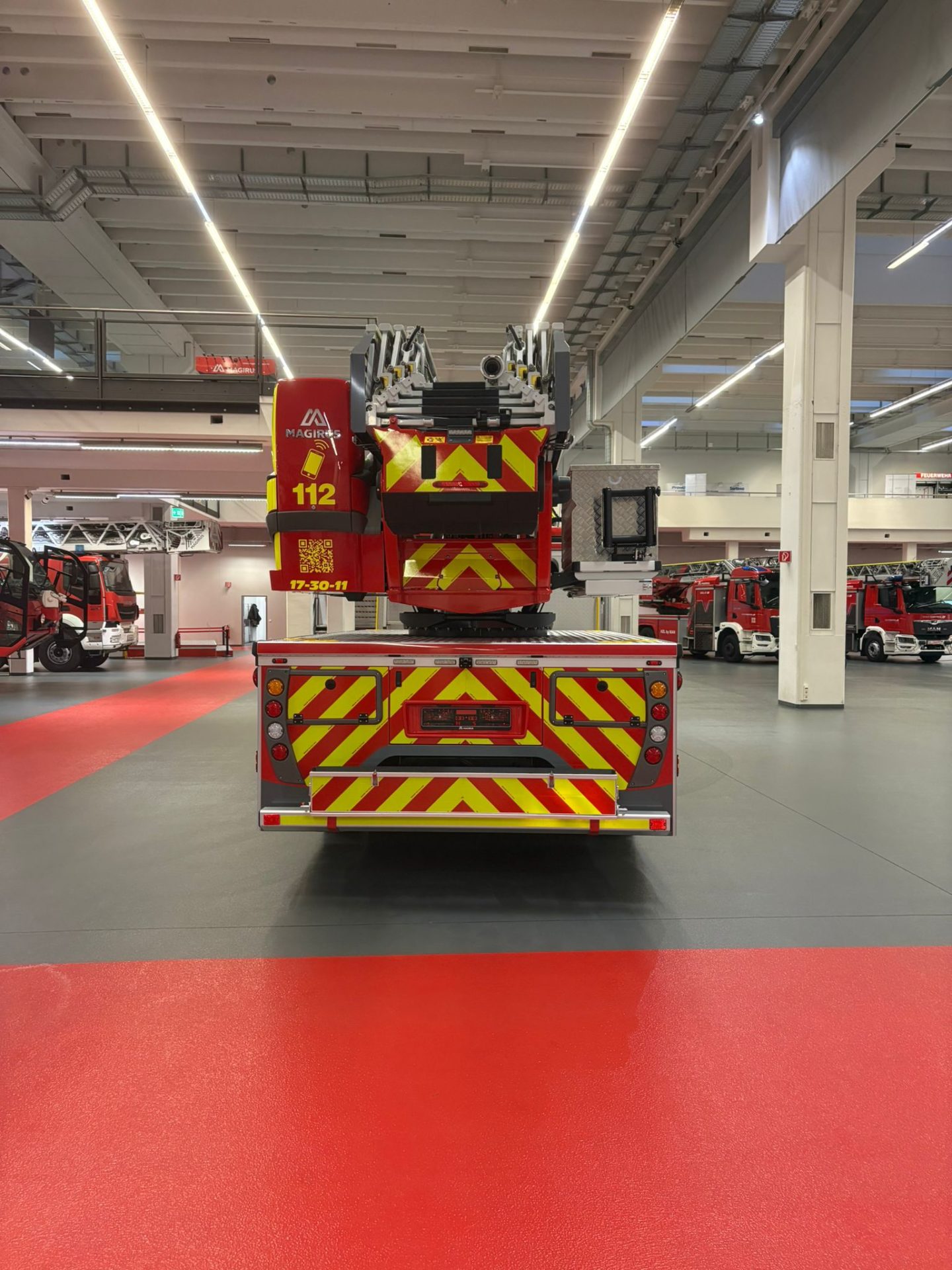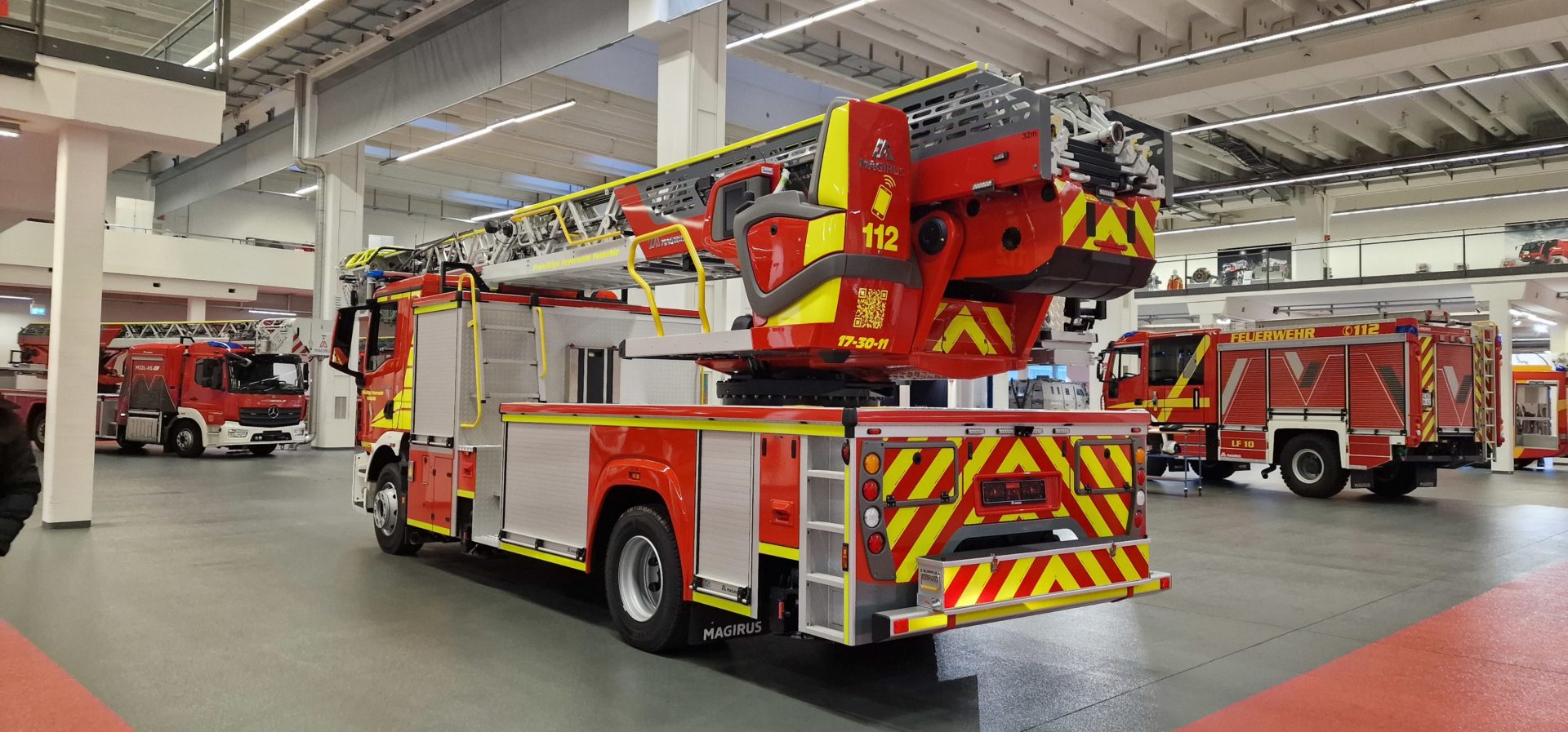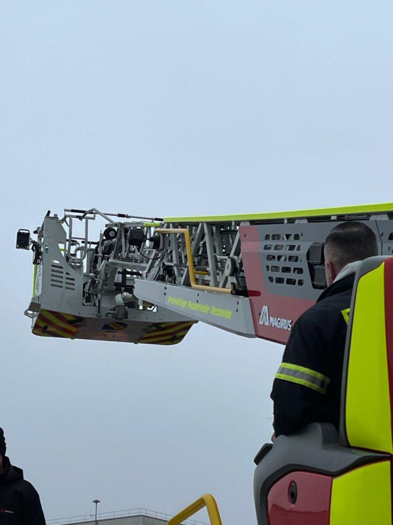 Im Rahmen der Abnahme beim Hersteller Magirus wurden nicht nur die technischen Daten und die vertraglich vereinbarten Leistungsmerkmale überprüft, sondern insbesondere auch die Funktionalität und Zuverlässigkeit aller sicherheitsrelevanten Systeme. Dazu zählten unter anderem die Bewegungsabläufe des Leiterparks, die neue Steuerungstechnik, der Notbetrieb sowie die Beladung und Ergonomie des Fahrzeugs. Ergänzend fanden erste Präsentationen und Erläuterungen statt, bei denen das Abnahmeteam einen umfassenden Einblick in die neue Technik und die Besonderheiten der Drehleiter erhielt. Insbesondere die Steuerung der neuen Drehleiter unterscheidet sich dabei deutlich von der bisherigen Technik der vorhandenen Drehleiter.