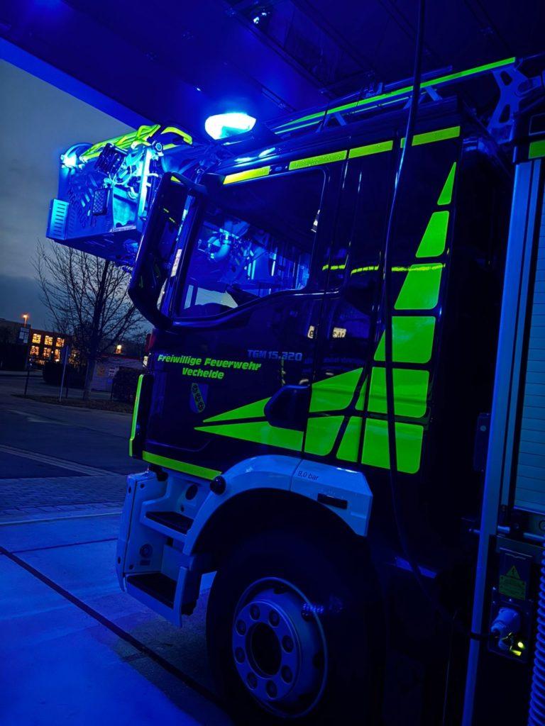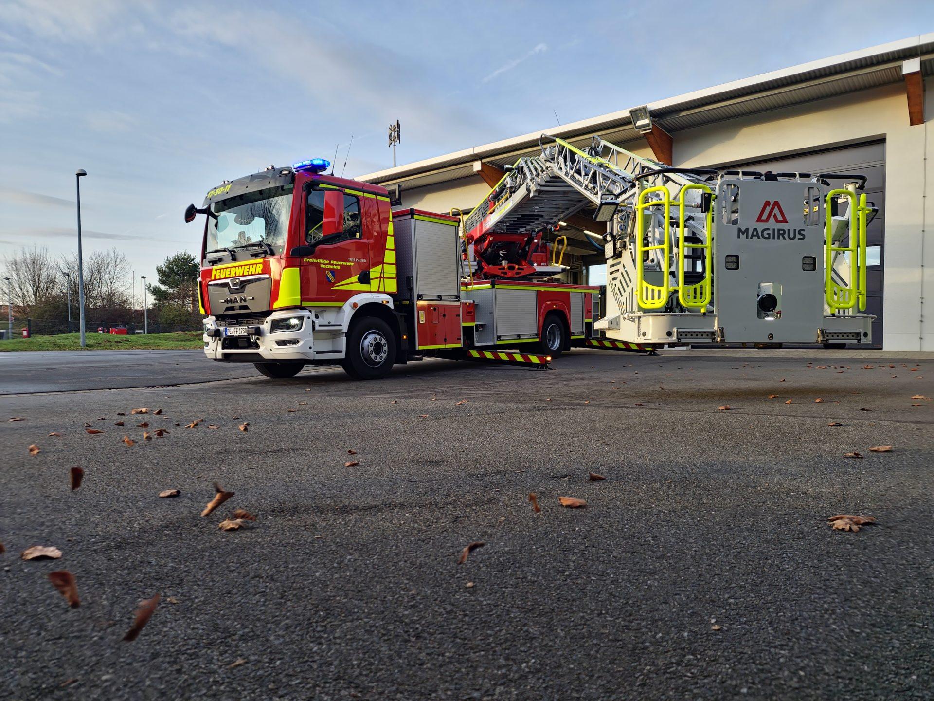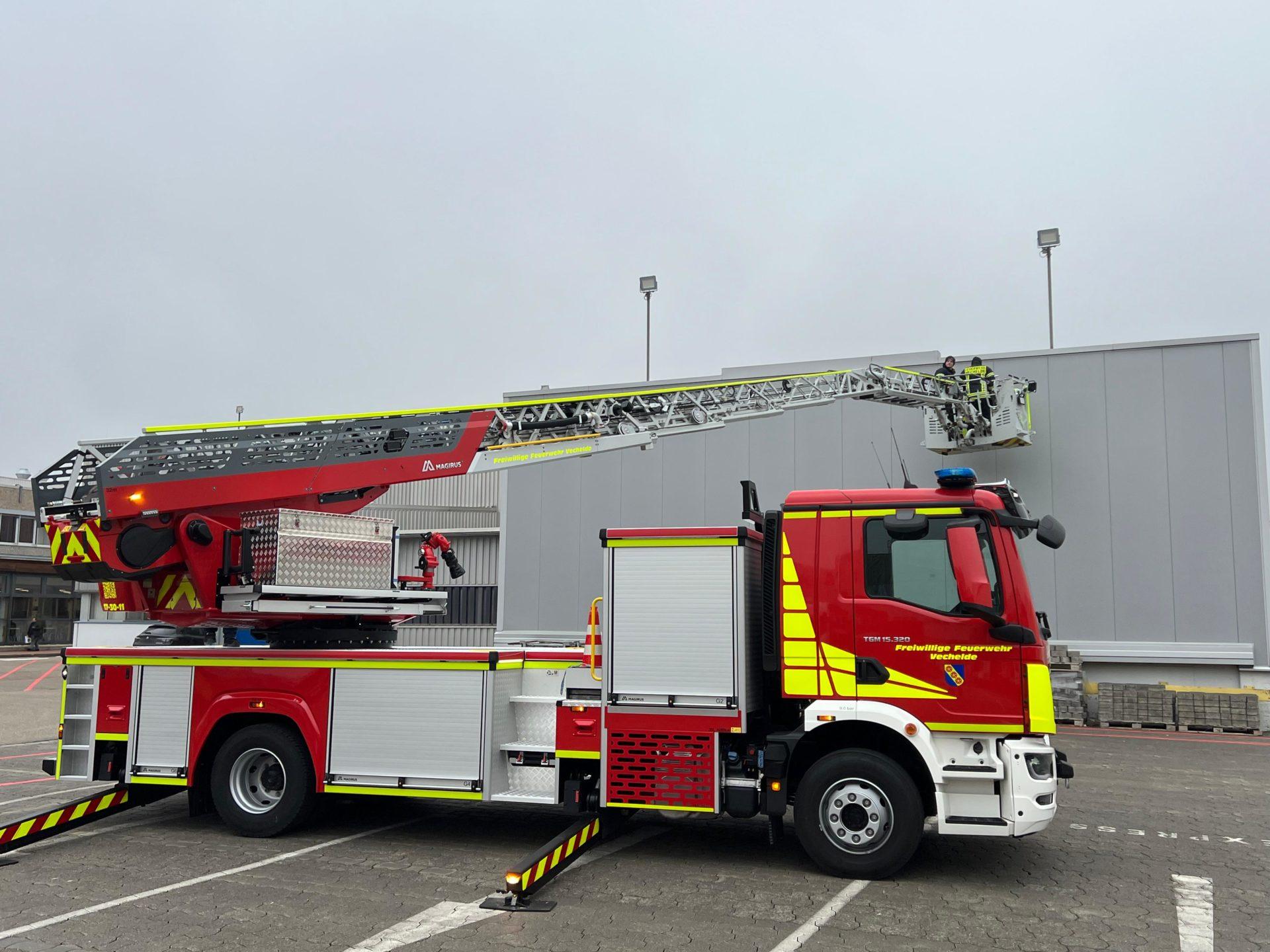 Ein besonderes technisches Merkmal der neuen Drehleiter ist der fünfteilige Leiterpark mit einem teleskopierbaren Gelenkteil. Dieses ermöglicht das Anleitern von Einsatzstellen, die mit der bisherigen Drehleiter nicht oder nur eingeschränkt erreichbar waren. Von besonderer Bedeutung für die Vechelder Verhältnisse sind die hohen Ausladungswerte des Leitersatzes. Darüber hinaus kann durch das teleskopierbare Gelenkteil eine maximale Arbeitshöhe von rund 32 Metern erreicht werden, wodurch sich die Einsatzmöglichkeiten erheblich erweitern. Der neue Rettungskorb verfügt über eine Nutzlast von 500 Kilogramm und bietet damit Platz für bis zu fünf Personen – bei der bisherigen Drehleiter war die Nutzung auf drei Personen begrenzt. Darüber hinaus können mit dem neuen Rettungskorb Personen mit hohem Körpergewicht von bis zu 270 Kilogramm liegend über die aufsteckbare Krankentragenhalterung gerettet werden (bisher 150 Kilogramm). Ergänzend steht ein spezielles Rettungssystem zur Verfügung, das unter dem Rettungskorb adaptiert werden kann und in Verbindung mit einer Schwerlastkorbtrage die Rettung von Personen bis zu 300 Kilogramm ermöglicht.