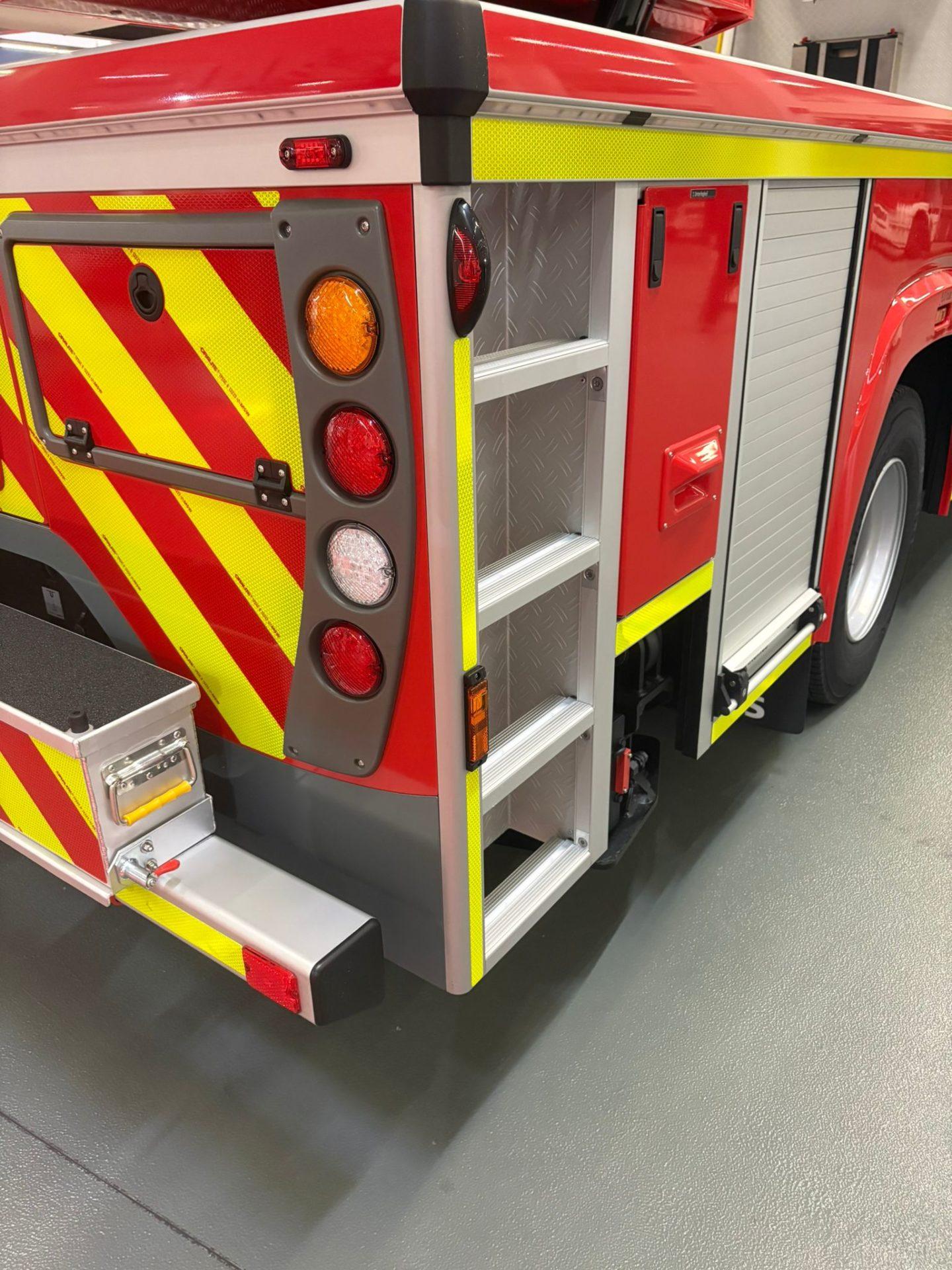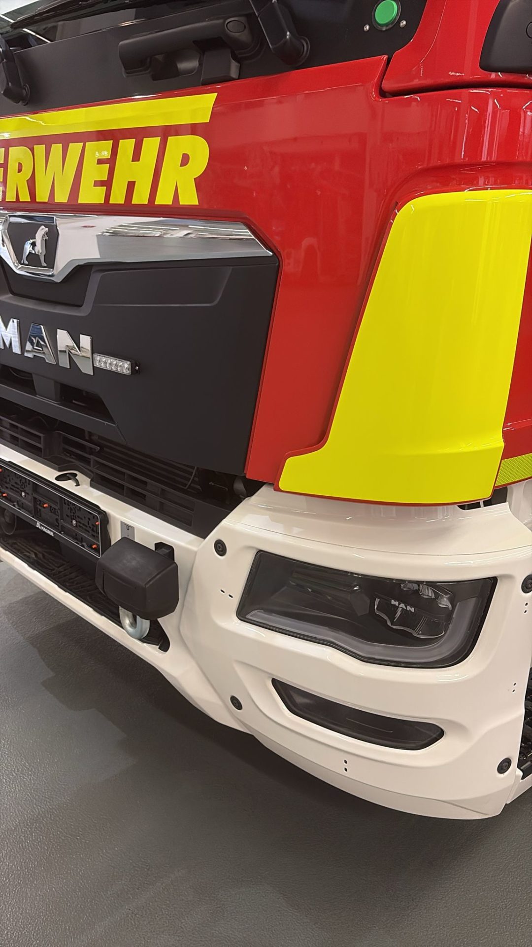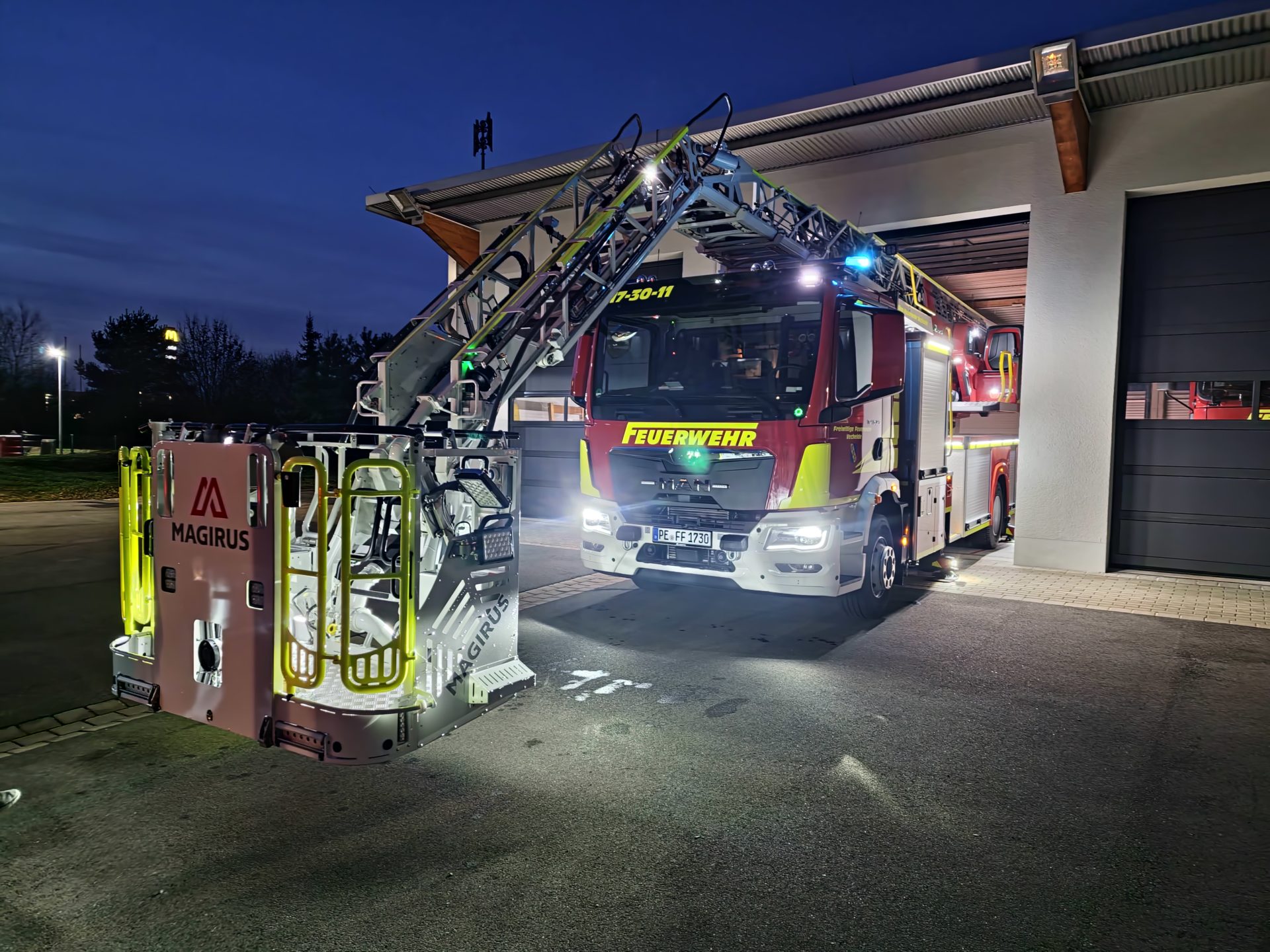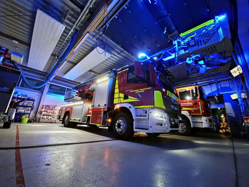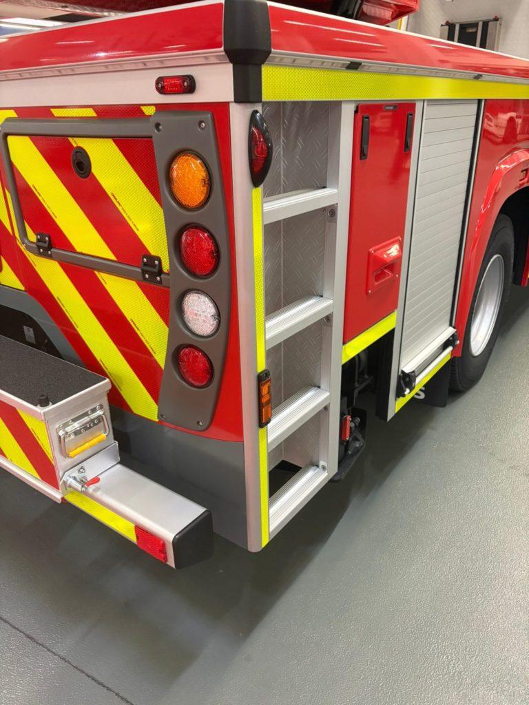 Der Rettungskorb ist zudem direkt mit einer fest verlegten Wasserleitung im obersten Leiterparkteil verbunden. Dadurch muss lediglich ein B-Druckschlauch angeschlossen werden, um unmittelbar aus dem Rettungskorb Löschwasser abgeben zu können – eine Montage des Wenderohrs ist hierfür nicht mehr zwingend erforderlich. Das Fahrzeug verfügt außerdem über eine umfangreiche LED-Beleuchtung, sodass ein separater Stromerzeuger zur Ausleuchtung von Einsatzstellen nicht mehr notwendig ist. Zusätzlich sind auf dem Fahrzeug vier Rangierhilfen verlastet, mit denen im Einsatzfall parkende oder im Weg stehende Fahrzeuge schnell und kraftsparend bewegt werden können. Weitere technische Neuerungen und Ausstattungsdetails werden in einem separaten Bericht ausführlich vorgestellt.