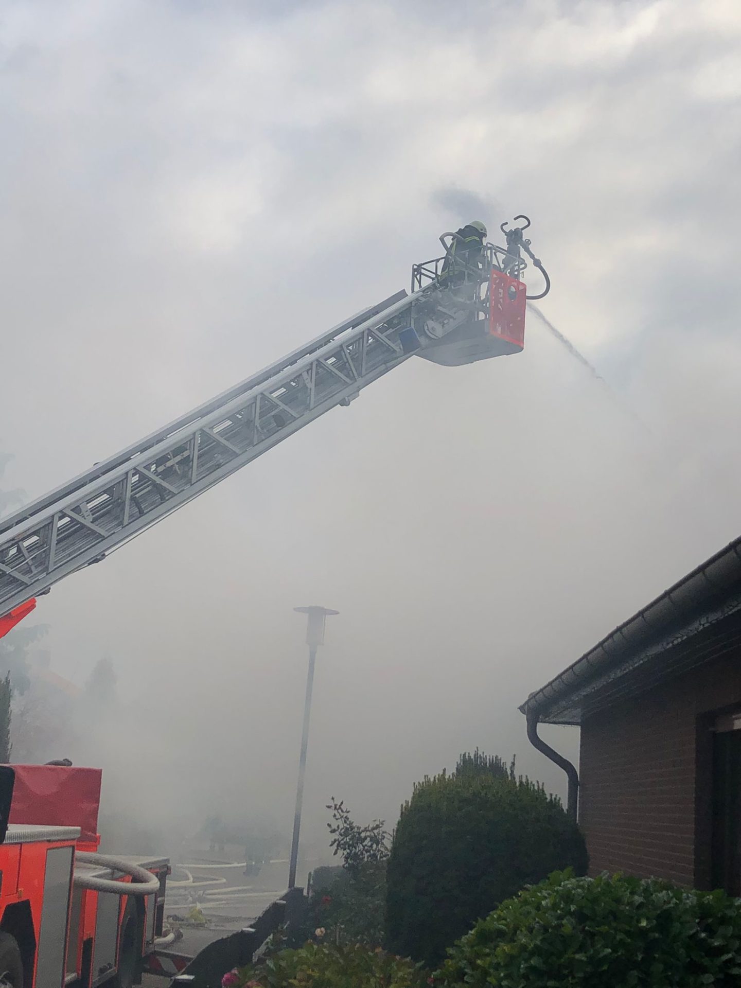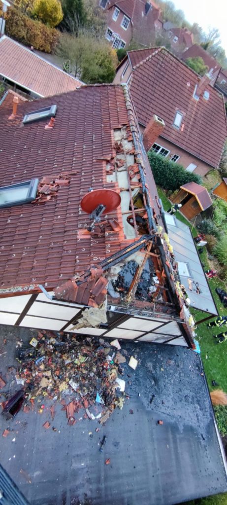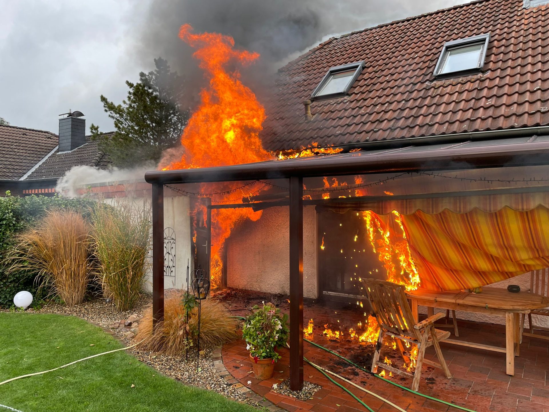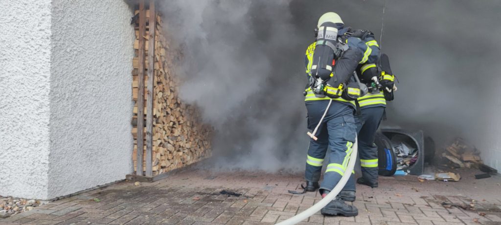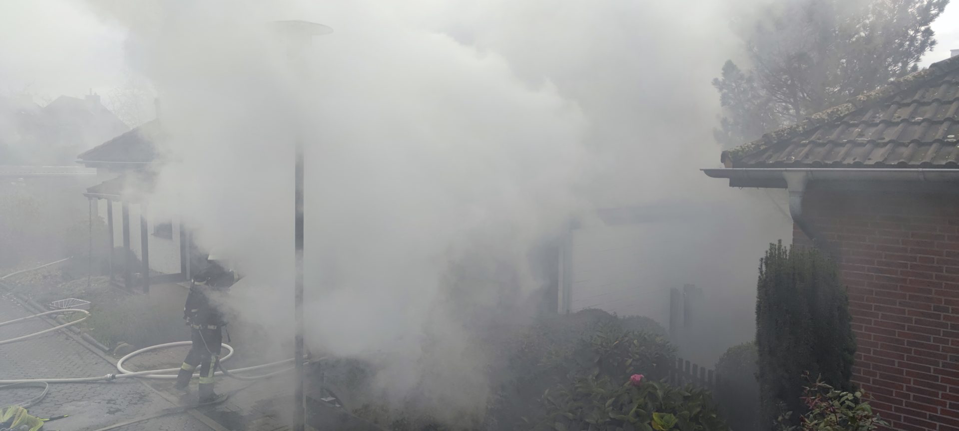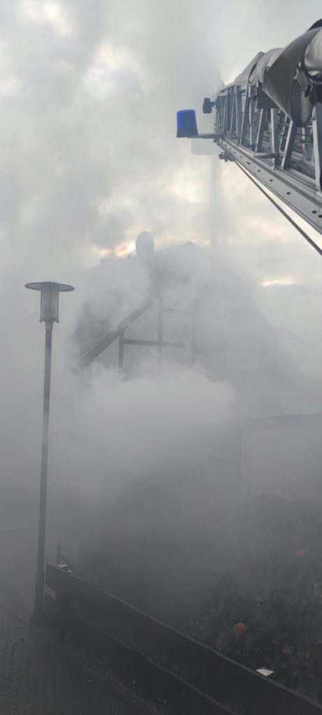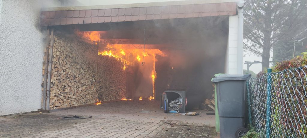 Der dem Löschzug mit dem Einsatzleitwagen vorausfahrende Ortsbrandmeister konnte bereits auf der vom Brandrauch eingenebelten Albert-Schweitzer-Straße feststellen, dass es sich um ein größeres Brandereignis handelt. Vorgefunden wurde dann tatsächlich ein Geräteschuppen hinter einem Carport im Vollbrand. Das Feuer hatte sich bereits auf den Carport, dort gelagertes Brennholz, die Fassade des Wohnhauses und die Dacheindeckung ausgebreitet. Die Erkundung der Gebäuderückseite führte zu der Erkenntnis, dass dort das Feuer auf einen Freisitz übergegriffen hatte – dort brannten eine Markise, Möbel und die Bedachung. Damit aber noch nicht genug, von dort aus war das Feuer über den Traufenkasten unter die Dacheindeckung in Dachzwischenräume des Einfamilienhauses gelaufen. Es kam zu einer erheblichen Rauchentwicklung, die selbst von der Besatzung des auf einem Rückflug befindlichen Rettungshubschrauber Christoph 30 aus großer Entfernung erkannt wurde und dazu führte, das beim Eintreffen der Einsatzkräfte der Rettungshubschrauber über dem Einsatzort kreiste.