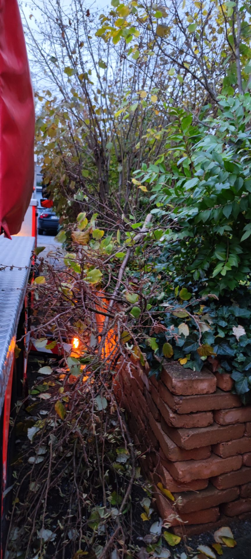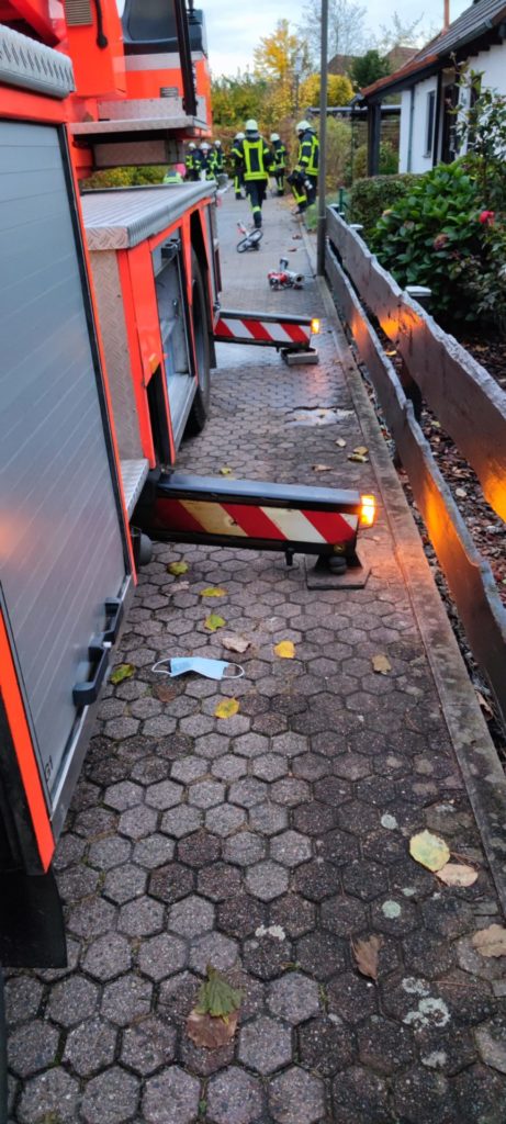 Eine besondere Herausforderung hatte die Drehleiterbesatzung zu bewältigen. Aufgrund der sehr schmalen Zufahrt/Aufstellfläche konnte der Leitersatz erst zum Objekt gedreht werden, nachdem mit einer akkubetriebenen Säbelsäge Buschwerk hinter einer Gartenmauer beseitigt worden war.